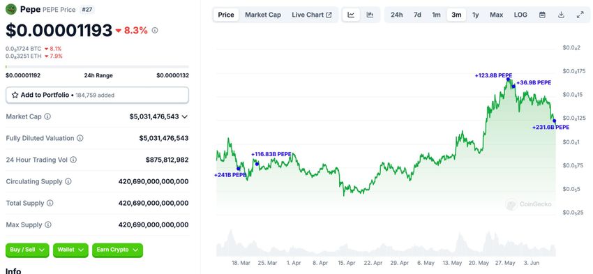 È interessante notare che questa acquisizione arriva mentre il prezzo di PEPE fluttua dopo la picca di fine maggio.