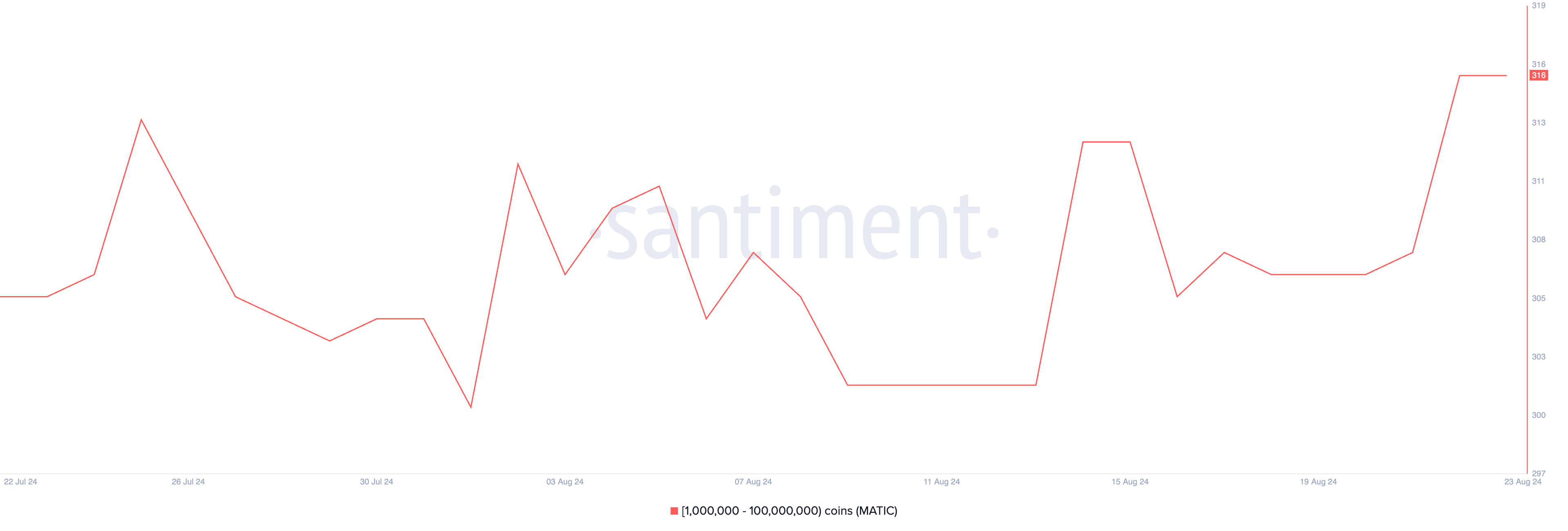 Il rialzo a due cifre ha attirato grandi investitori, con il numero di indirizzi di whale che detengono tra 1.000.000 e 100.000.000 di token MATIC salito al massimo di un mese di 316.