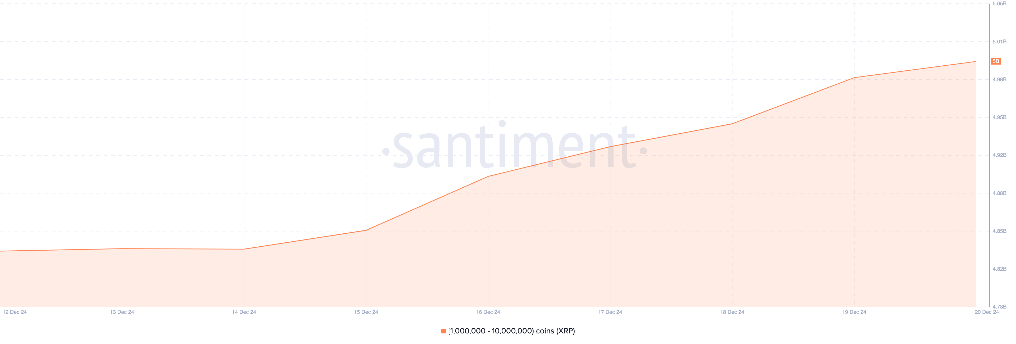 Classificato come la 4a criptovaluta più preziosa, XRP è di nuovo parte degli altcoin che le crypto whales stanno comprando. Il 15 dicembre, il saldo degli indirizzi che detengono tra 1 milione e 10 milioni di XRP era di 4.85 miliardi USD.
