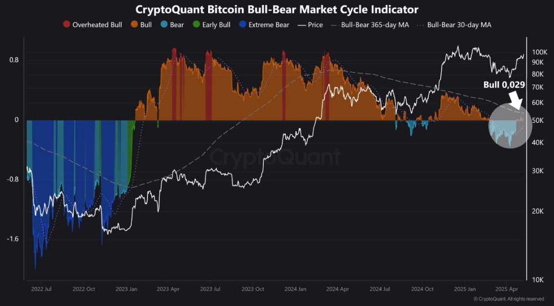 Invece, l’analista Kyledoops ha notato su X che l’Indicatore Bull-Bear di CryptoQuant ha appena registrato la sua prima lettura rialzista da febbraio, sebbene sia debole, mentre BTC ha riconquistato i $100.000.