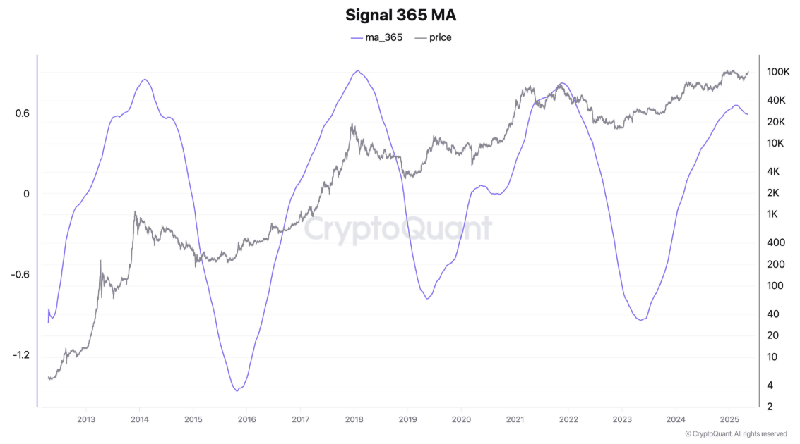 Tuttavia, Ju insiste che i dati on-chain mantengono un valore analitico. Cita il grafico Signal 365 MA come barometro a lungo termine. Questo indicatore traccia la deviazione del prezzo di Bitcoin dalla sua media mobile a 365 giorni.