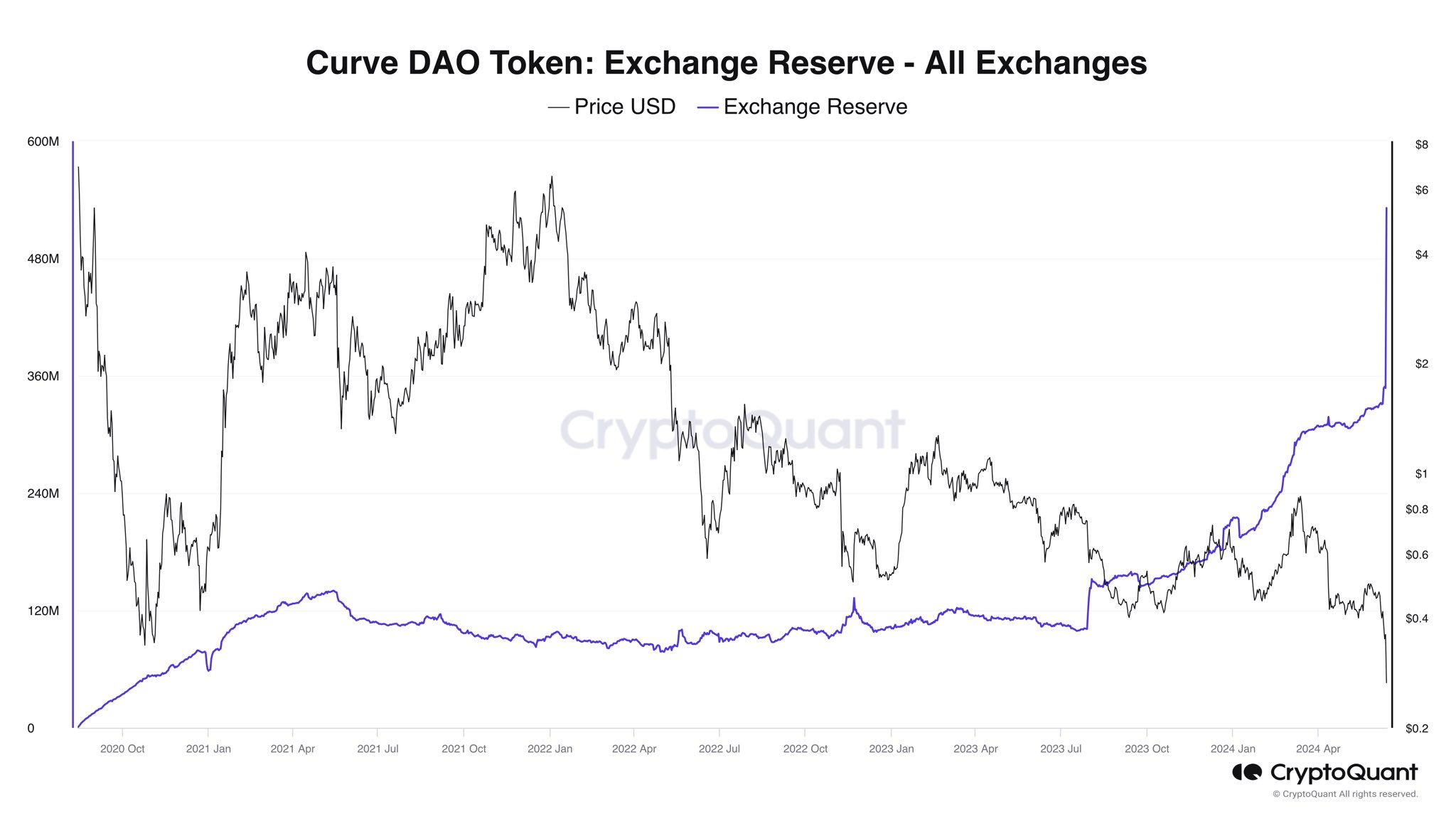 Detto questo, Ki Young Ju, fondatore di un’altra piattaforma di analisi sul blockchain, CryptoQuant, ha osservato un aumento significativo del saldo di CRV sulle piattaforme di scambio, raggiungendo un massimo storico. È aumentato del 57% in sole quattro ore.