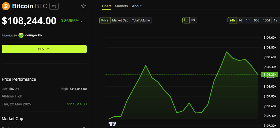 Al momento della pubblicazione, Bitcoin è stato scambiato a $108.244, avendo registrato un aumento dello 0,87% nelle ultime 24 ore.