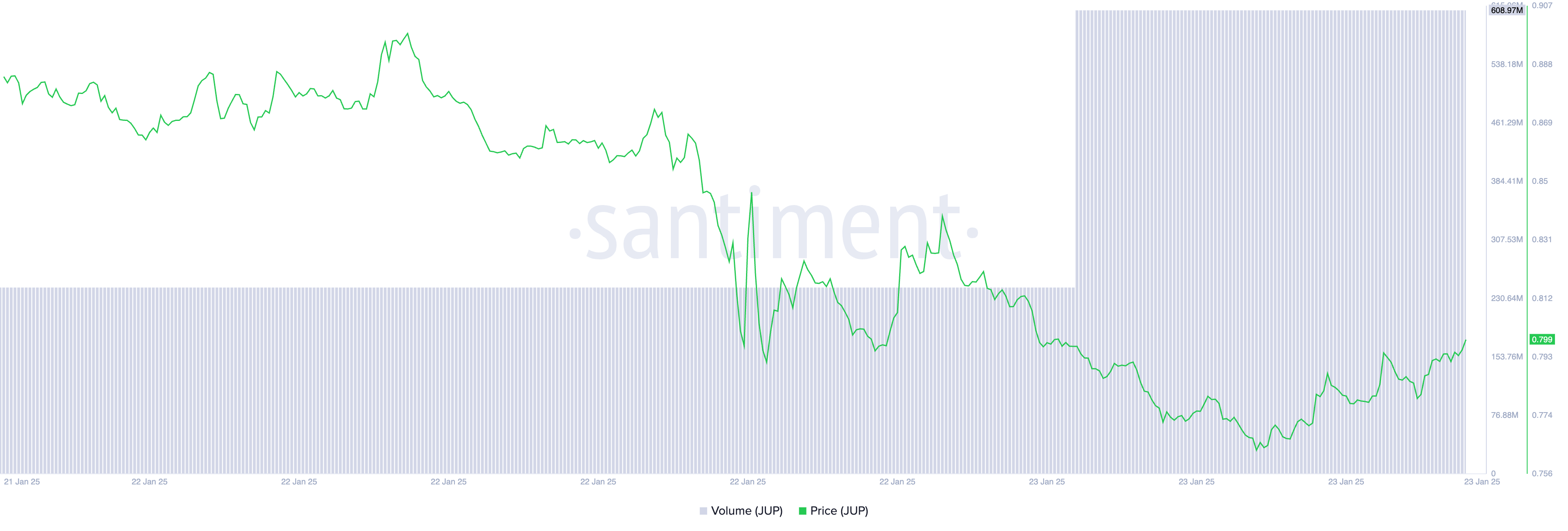 SponsoredAl momento della stampa, l’altcoin viene scambiato a 0.79 USD, registrando un calo del prezzo del 9% nelle ultime 24 ore. Nello stesso periodo, il volume di scambio è aumentato del 166%, totalizzando 609 milioni USD. Questo conferma l’aumento delle vendite di JUP tra i partecipanti al mercato.