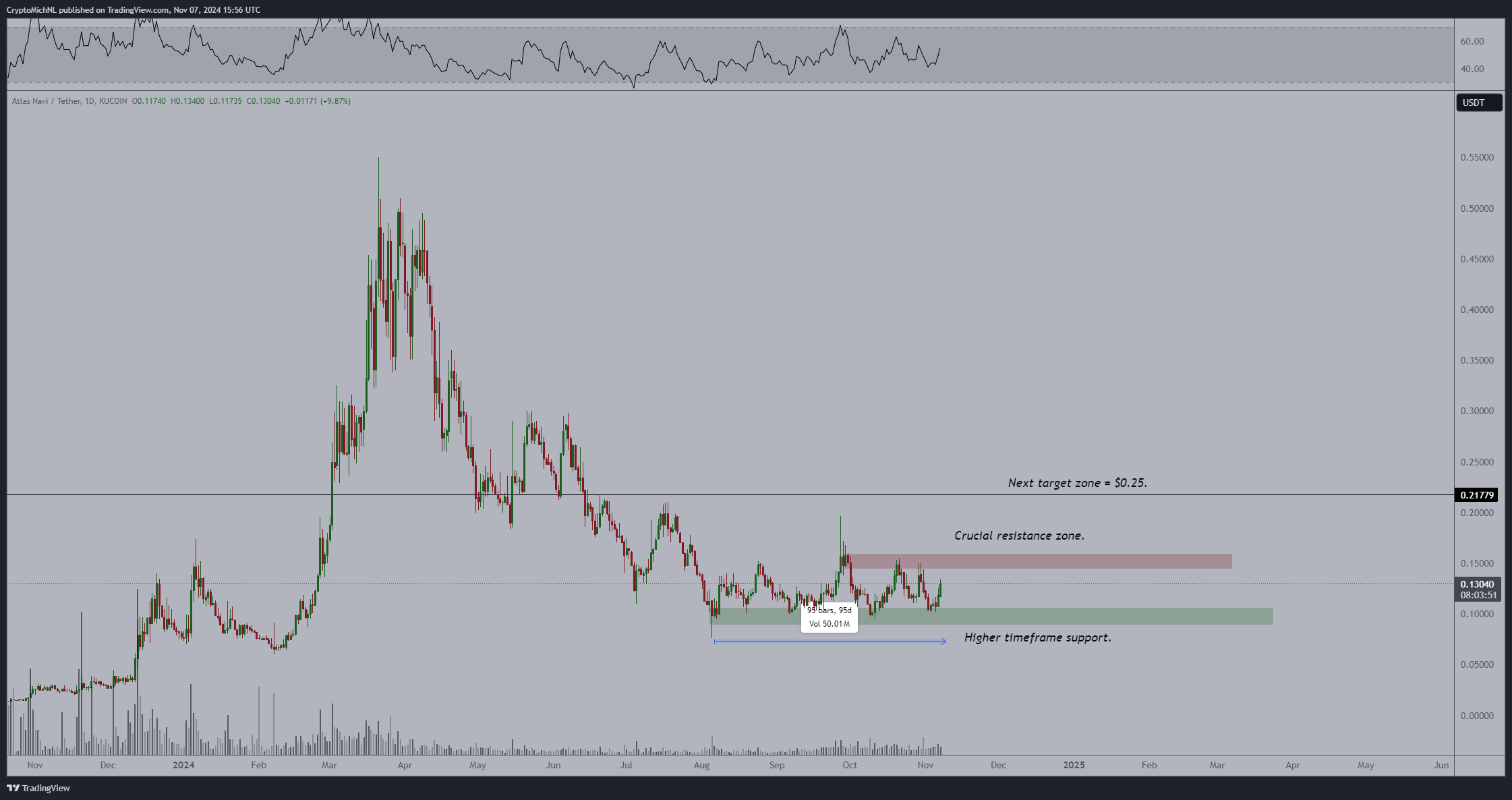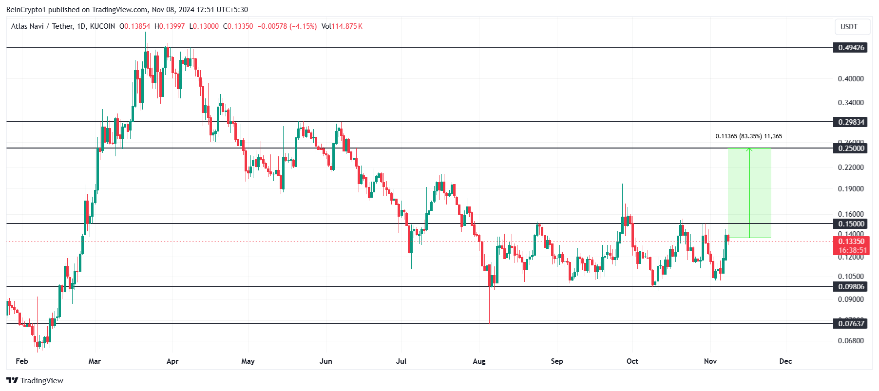 Attualmente, NAVI si scambia a 0,133 USD e mira a rompere la sua fase di consolidamento di tre mesi superando il livello di resistenza di 0,150 USD. Una chiusura sopra questo livello segnalerebbe un possibile cambio di tendenza, portando potenzialmente a guadagni. Anche se ciò potrebbe non spingere immediatamente NAVI a 0,250 USD, indicherebbe un crescente slancio rialzista.
