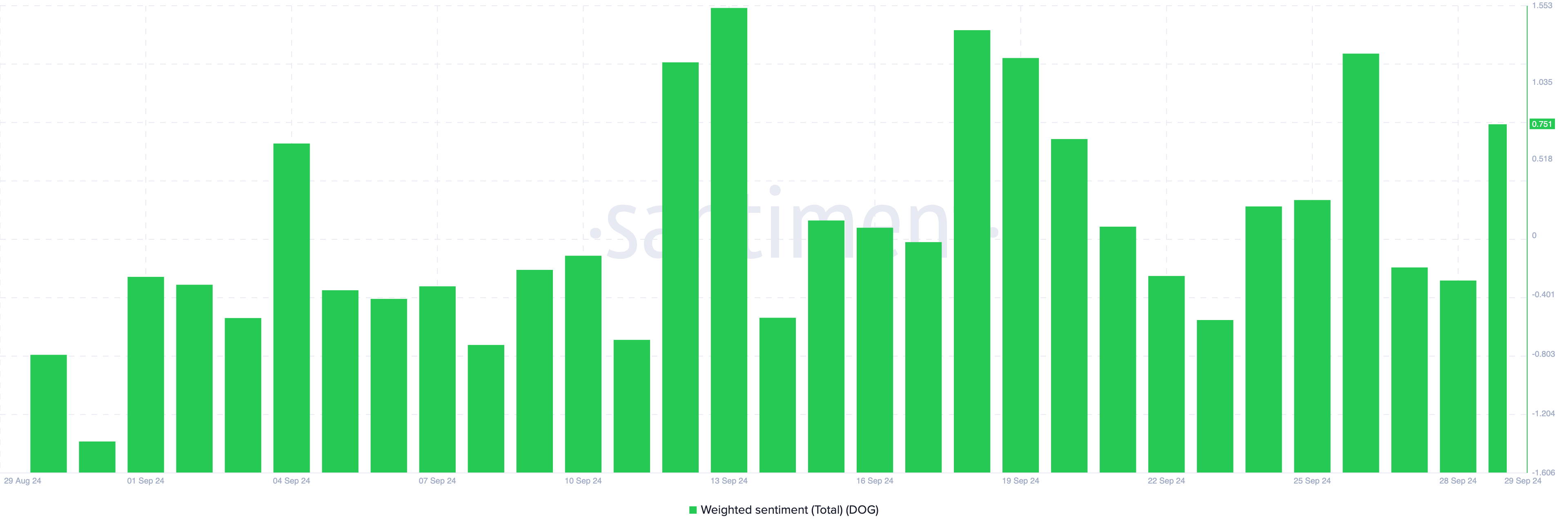 Attualmente, il prezzo di DOG è di 0,0040 USD. Anche se rappresenta una diminuzione del 5% nelle ultime 24 ore, rappresenta un aumento del 62% dalla scorsa settimana. A seguito di questo sviluppo, il Sentimento Ponderato attorno ai memecoin basati su Bitcoin è aumentato.