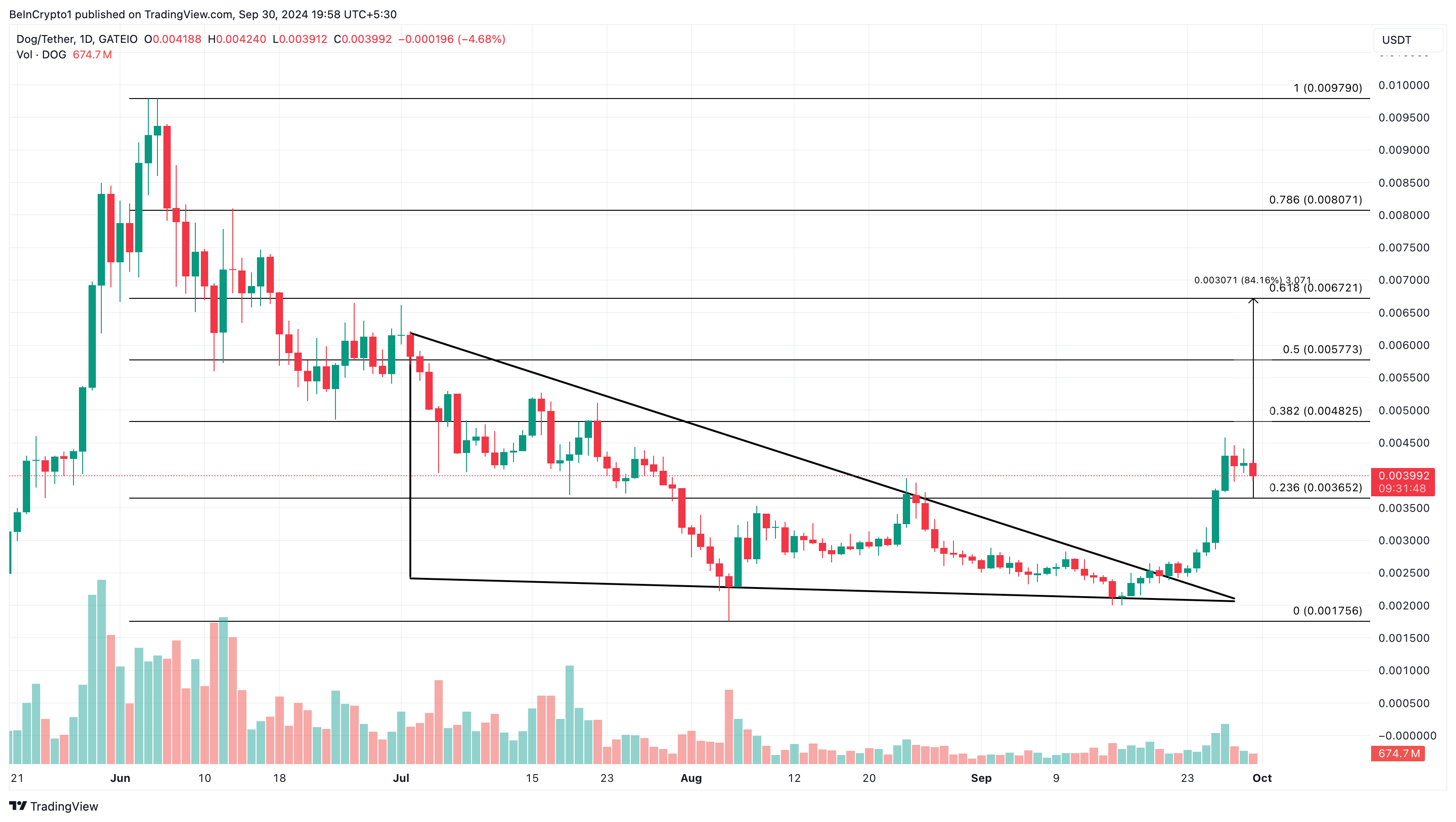 Tuttavia, al momento della scrittura, il memecoin ha superato il triangolo. Questa rottura è stata fondamentale per portare DOG a 0,0042 USD nel fine settimana.