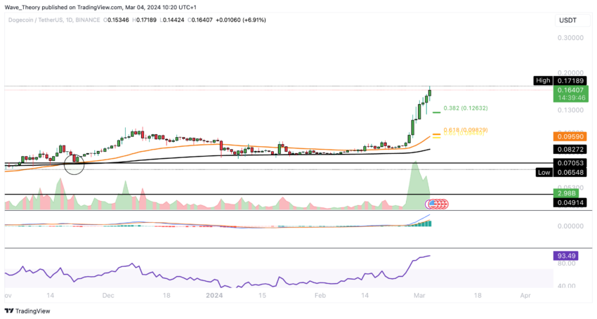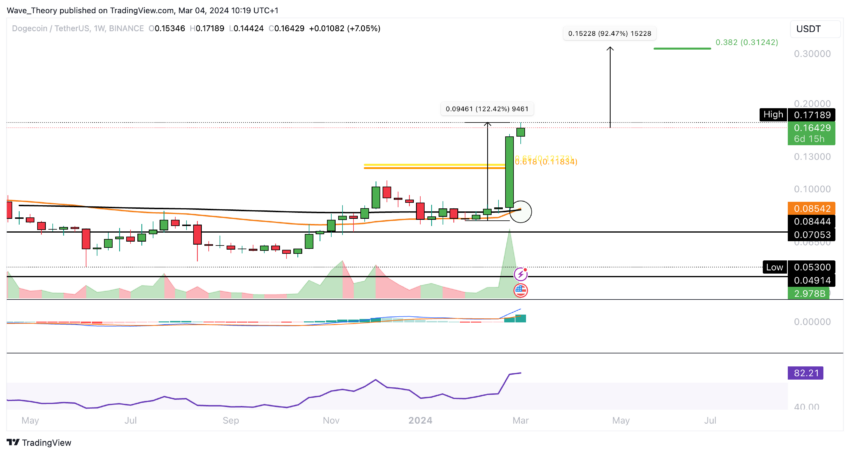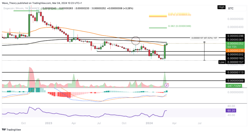 Gli indicatori suggeriscono attualmente uno slancio rialzista, con un incrocio dorato delle medie mobili esponenziali (EMA) nel grafico settimanale di Dogecoin che indica una tendenza rialzista a medio termine. Inoltre, il Dogecoin ha registrato guadagni impressionanti rispetto al Bitcoin, con un aumento di circa il 67,5% da febbraio, nonostante il potenziale del Bitcoin per un nuovo massimo storico (ATH).