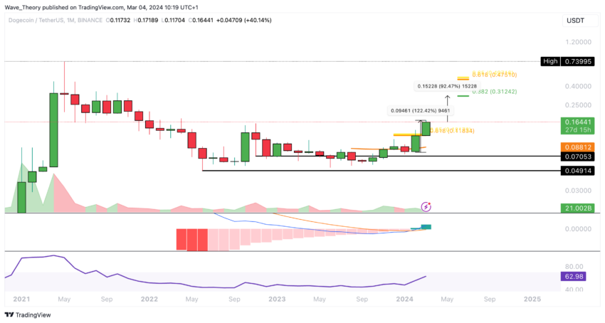 IlDogecoin ha registrato un’impennata notevole in poco più di un mese, segnando un aumento di prezzo del 122%. La rottura della resistenza del rapporto aureo a circa 0,12 dollari ha aperto la strada a ulteriori guadagni, con resistenze significative di Fibonacci ora a 0,31 e 0,48 dollari, suggerendo un potenziale rialzo del 93%.