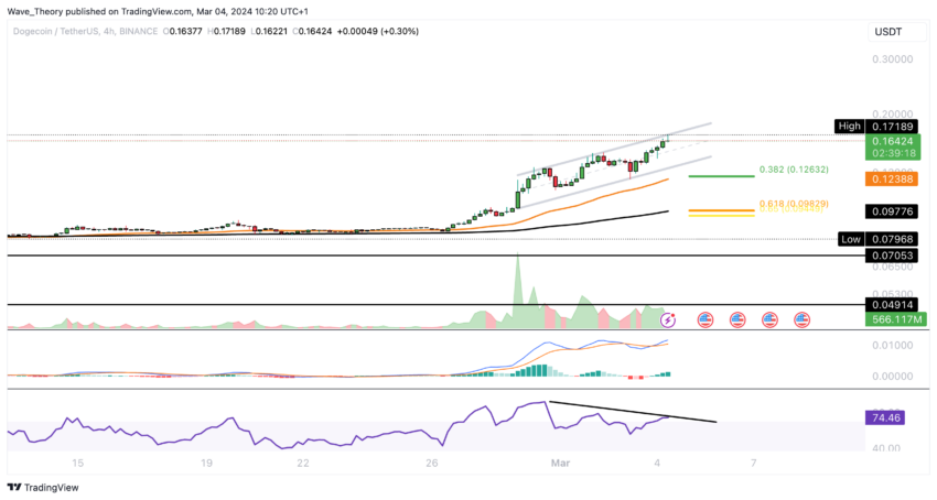 Sul grafico a 4 ore del Dogecoin si nota una divergenza ribassista in mezzo al canale parallelo ascendente. Tuttavia, le linee MACD rimangono incrociate in modo rialzista e l’istogramma MACD mostra uno slancio verso l’alto.