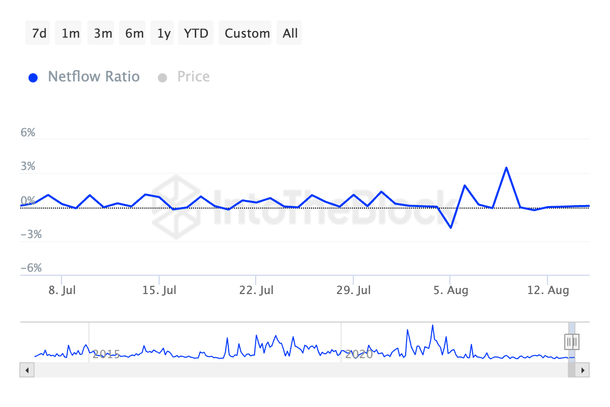 Un rapporto elevato tra flusso netto dei grandi detentori e flusso netto degli scambi indica una forte accumulazione da parte dei grandi detentori, che è un segnale rialzista. Al contrario, un rapporto basso indica una maggiore attività di vendita da parte di questi investitori chiave, che esercita una pressione al ribasso sul prezzo dell’asset. Questo svendere spesso innesca l’azione dei trader al dettaglio, intensificando ulteriormente la pressione di vendita.