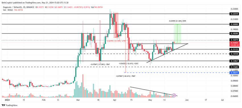 DOGE sta uscendo da questo schema al momento in cui scriviamo, con volumi in costante calo. Tuttavia, il pattern sarà convalidato quando la meme coin segnerà un rally del 22% per raggiungere $0,20. Questo punto di prezzo cruciale è stato contrassegnato come un obiettivo per il modello e rappresenta anche un supporto psicologico chiave.