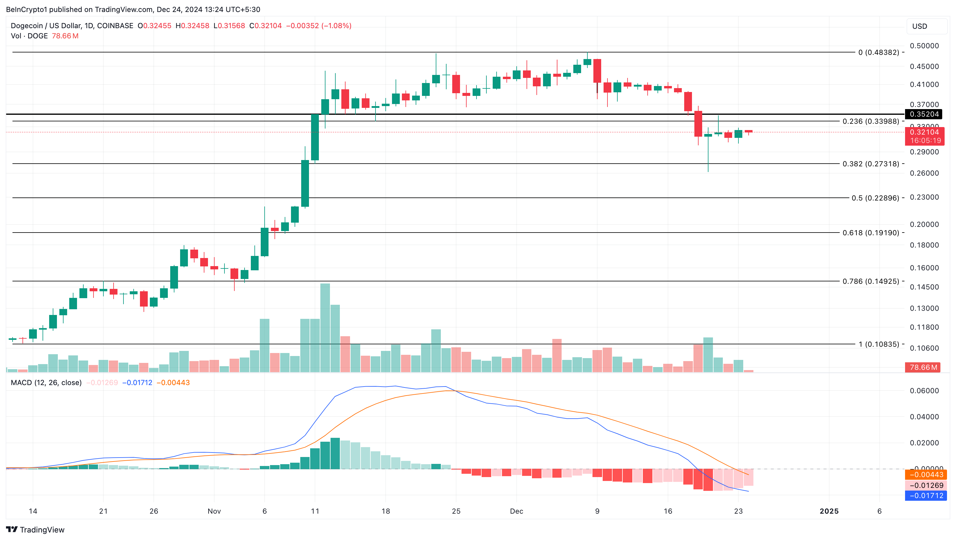 Nel grafico giornaliero, DOGE continua a perdere terreno sui livelli di supporto chiave. In particolare, la moneta è scesa al di sotto della regione di supporto di 0.35 USD poiché i rialzisti non sono riusciti a difendere la zona. Anche la Moving Average Convergence Divergence (MACD) supporta questo calo.