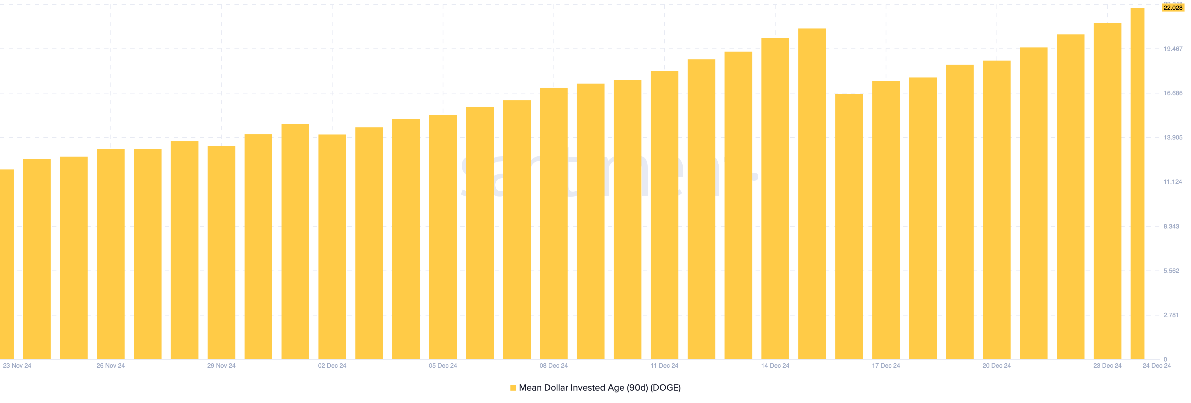 Il Mean Dollar Invested Age (MDIA) è un altro indicatore che suggerisce un ulteriore calo del prezzo di Dogecoin. Come suggerisce il nome, l’MDIA è l’età media di tutte le monete su una blockchain ponderata per il prezzo di acquisto.