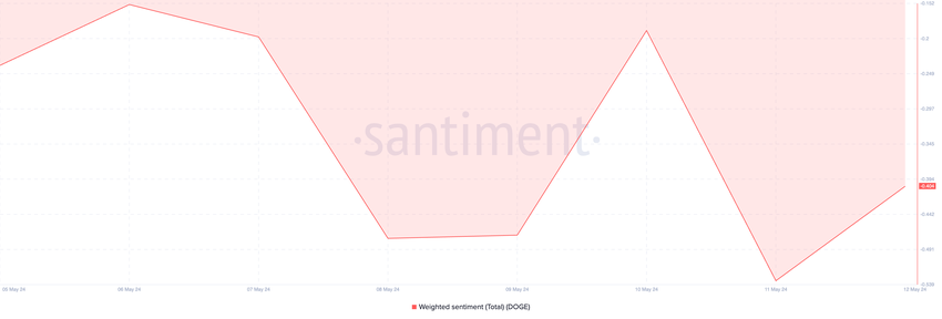 Sebbene il prezzo di DOGE sia aumentato del 7% nelle ultime 24 ore, continua a essere trainato da un sentiment ponderato negativo. Al momento della stesura di questo articolo, il Weighted Sentiment della moneta ha restituito un valore di -0,404. Questa metrica ha restituito un valore negativo dal 5 maggio.