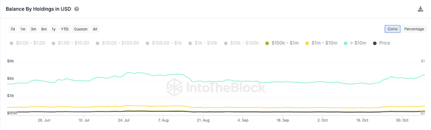 Dogecoin ha beneficiato immensamente del fatto che gli investitori di criptovalute hanno spostato l’attenzione sui mercati delle monete meme nelle ultime settimane. Secondo i dati di IntoTheBlock, le monete in custodia degli investitoribalenieri che detengono almeno 100.000 dollari di DOGE sono aumentate da 7,65 miliardi di dollari a 9,35 miliardi di dollari tra l’8 ottobre e oggi. Ciò implica che gli investitoribalenieri hanno aumentato il loro investimento di 1,7 miliardi di dollari nell’ultimo mese.