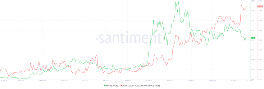 Ilprezzo di Dogecoin potrebbe essere testimone dell’impatto della recente mossa degli investitori whale. Gli indirizzi che detengono tra i 10 e i 100 milioni di DOGE hanno aggiunto poco più di 900 milioni di DOGE nell’arco di una settimana.