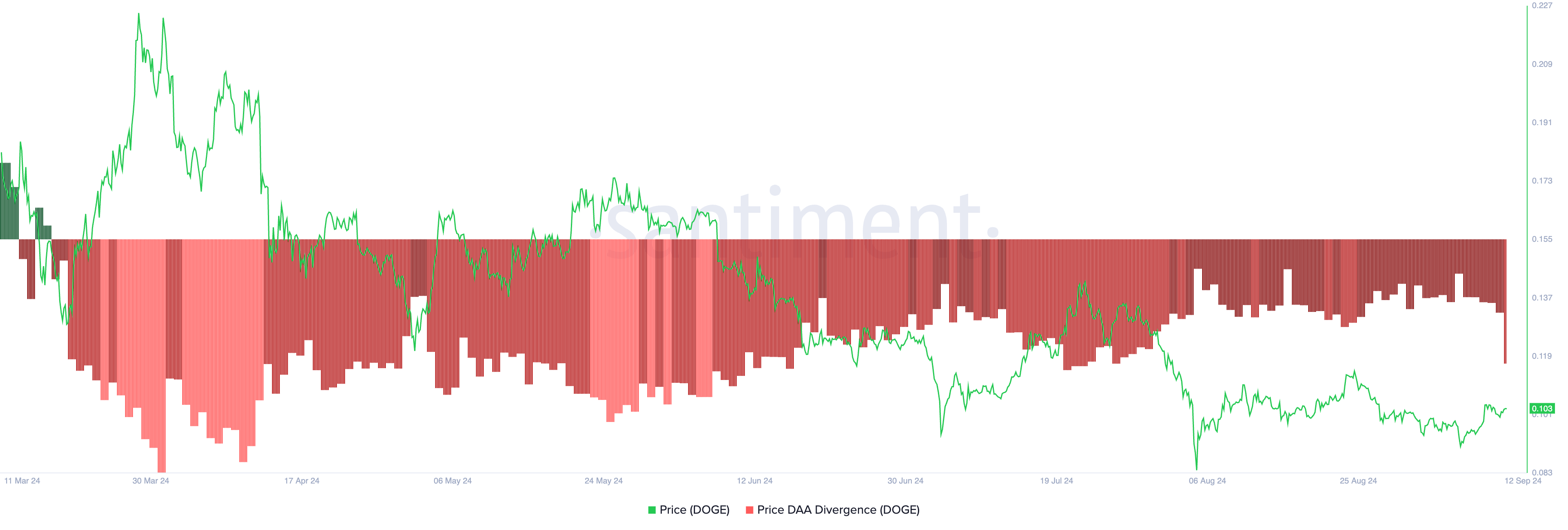Interessante notare che, nonostante il basso volume di scambio, il prezzo di Dogecoin ha registrato un modesto aumento del 3% nelle ultime 24 ore. Tuttavia, la divergenza negativa prezzo-DAA suggerisce che il rally è debole e probabilmente non sostenibile.