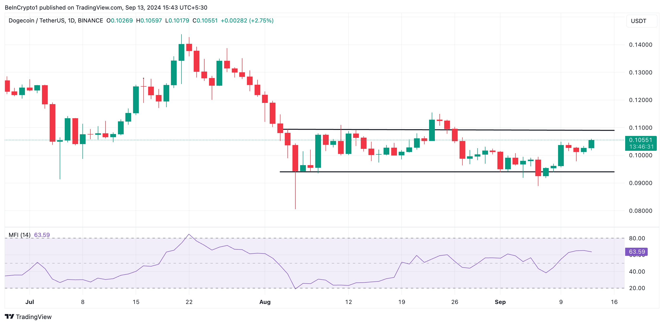 Il prezzo di Dogecoin (DOGE) è rimasto invariato nonostante un aumento dell’accumulo di monete, come mostrato dal suo crescente Indice di Flusso Monetario (MFI).