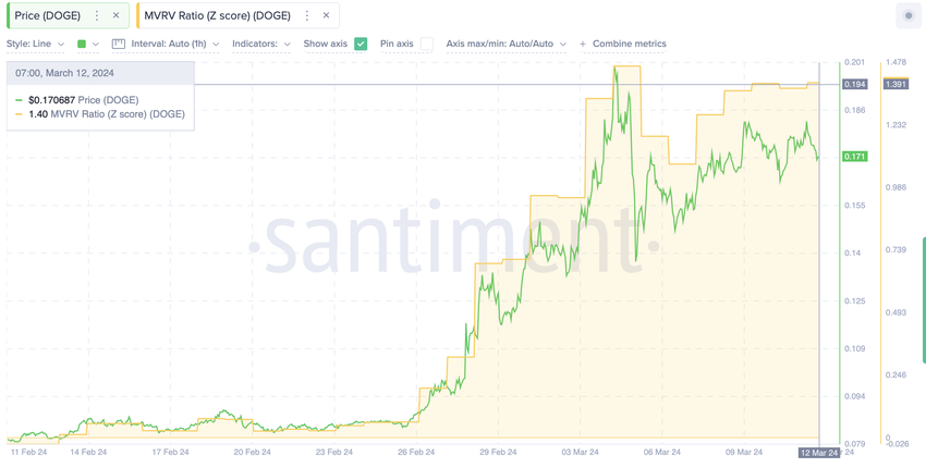 Il drastico aumento dello Z Score MVRV da 0,062 a 1,40 in sole due settimane per DOGE indica un potenziale caso di sopravvalutazione. Si tratta del più grande Z-Score MVRV per DOGE dal novembre 2021. In quell’occasione, dopo aver raggiunto tali livelli, il prezzo di DOGE ha subito una correzione di quasi il 50% nel mese successivo.