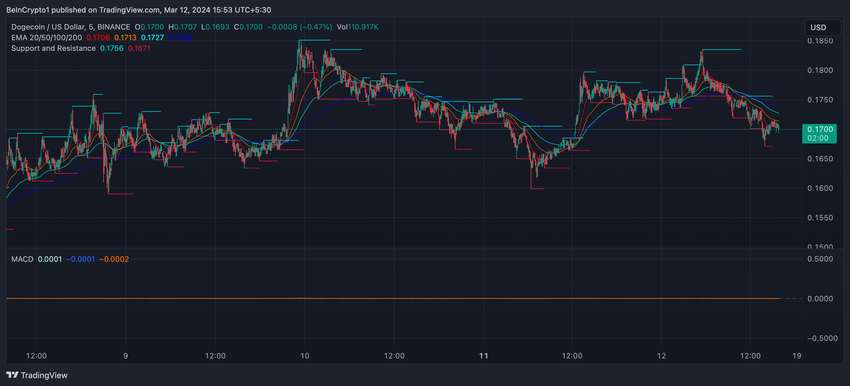 Analizzando le medie mobili esponenziali (EMA) di DOGE, è chiaro che recentemente l’EMA a lungo termine (200 giorni) ha incrociato le linee EMA a più breve termine, il cosiddetto Death Cross. Inoltre, la linea di prezzo DOGE è attualmente al di sotto delle linee EMA a lungo termine. Di solito, questo suggerisce una possibile tendenza al ribasso o il prevalere di un sentimento ribassista.