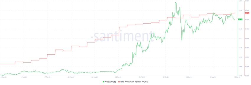 Il prezzo delDOGE ha seguito questa crescita, passando da 0,081 a 0,195 dollari tra il 10 febbraio e il 4 marzo. Tuttavia, il numero di titolari è rimasto stabile dopo questa crescita.