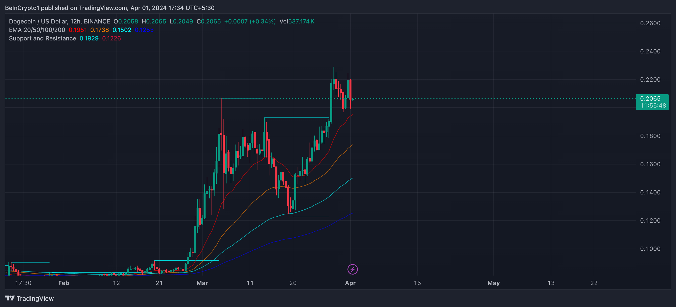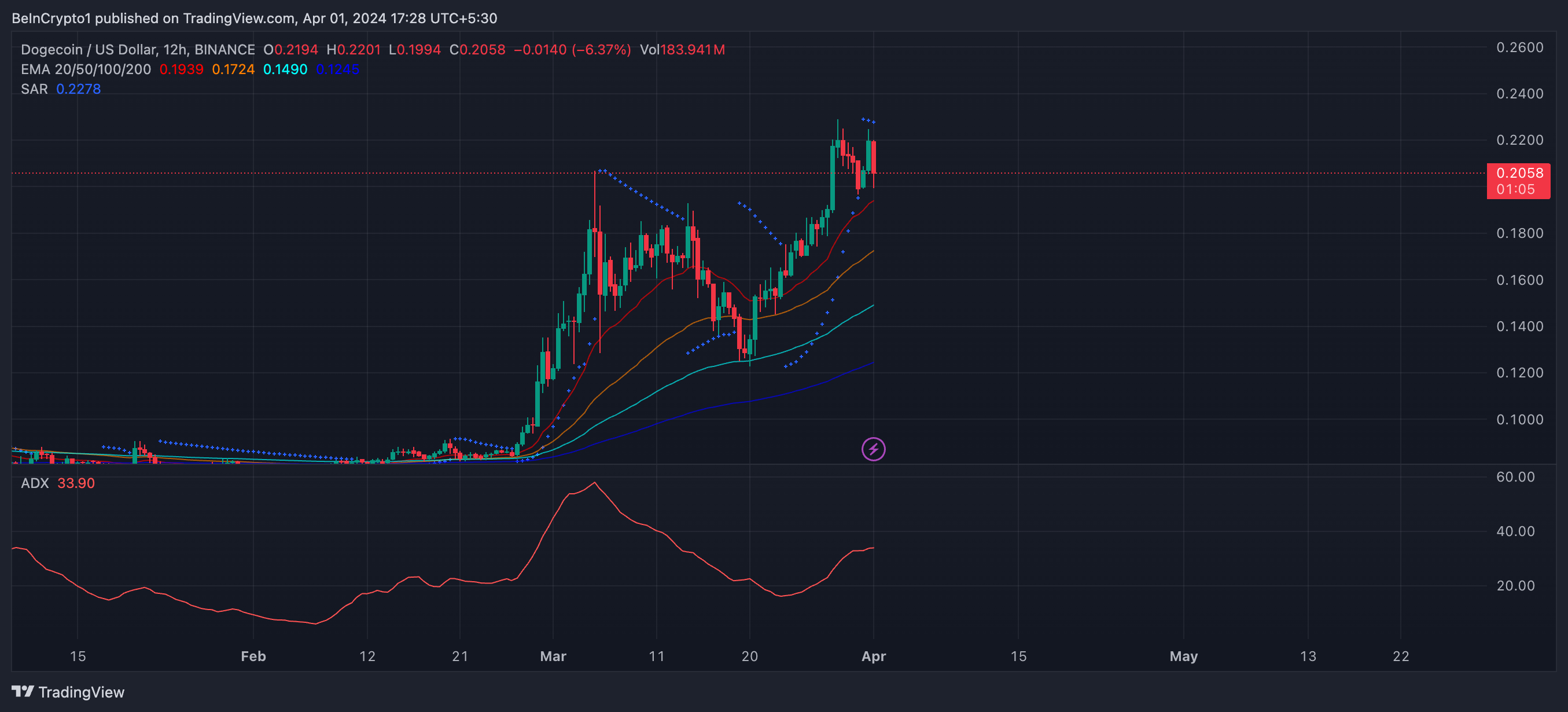 Come vedremo nel grafico del prezzo DOGE 4H, le linee EMA sono ancora rialziste. Tuttavia, altre metriche, come ADX e SAR, mostrano che questa tendenza potrebbe invertirsi presto.