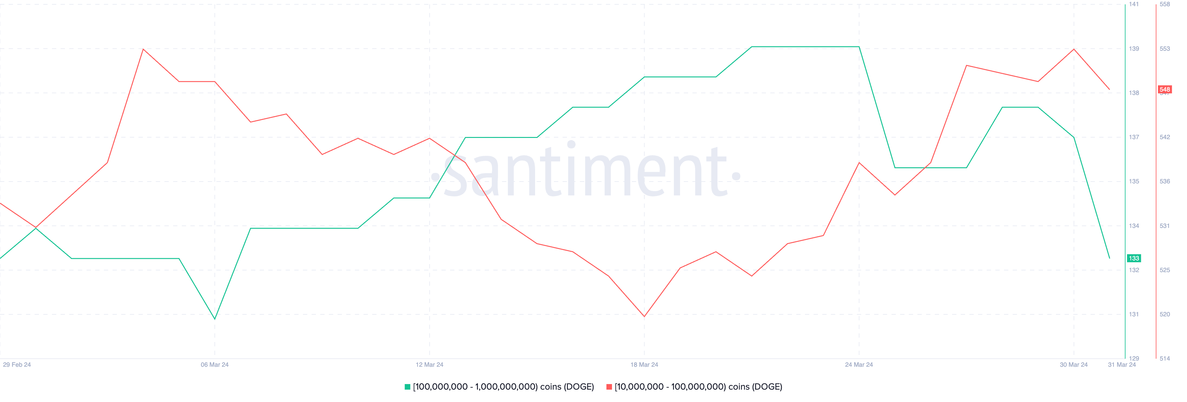 I detentori di DOGE tra 10 e 100 milioni sono scesi da 553 a 548 in un solo giorno, dopo essere passati da 520 a 553 tra il 18 e il 30 marzo. Quelli che detengono da 100 milioni a 1 miliardo di DOGE sono scesi da 137 a 133 nell’ultimo giorno. Il picco di 140 è stato raggiunto il 24 marzo.