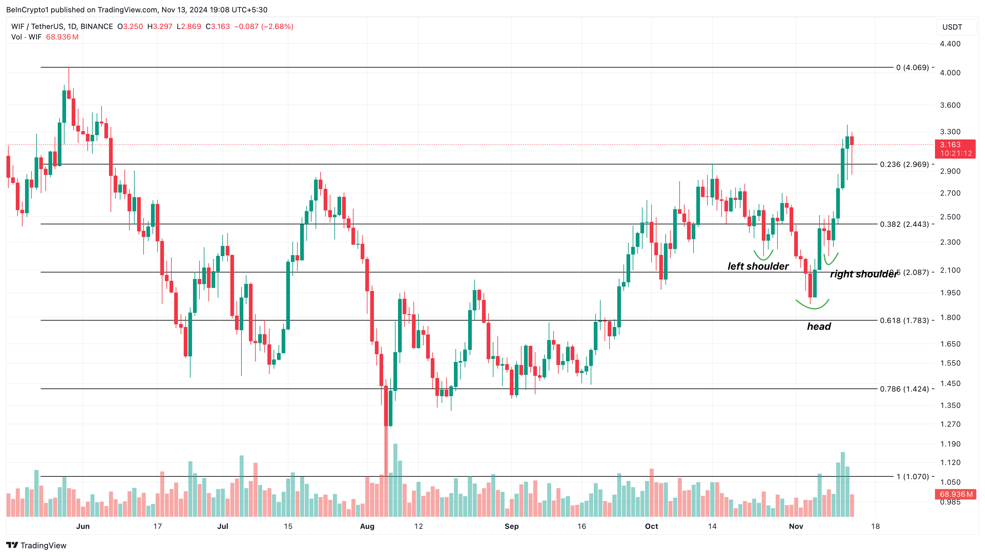 Tipicamente, questo pattern indica un passaggio da ribassista a rialzista. Di conseguenza, sembra che il prezzo di WIF possa continuare a salire. Con questo in gioco, è probabile che la memecoin possa salire a 4,07 USD.