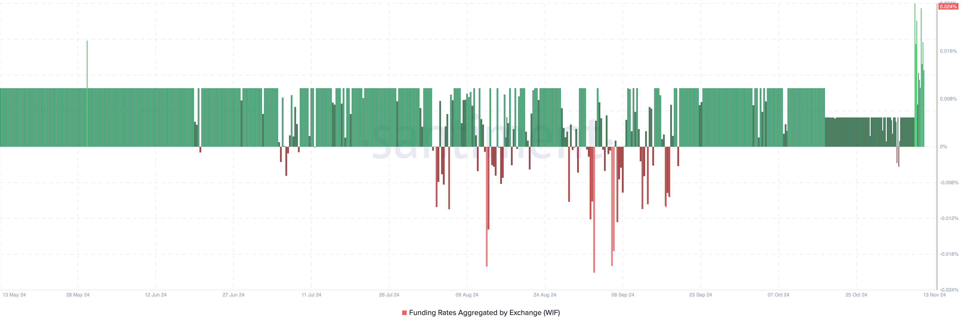 Se ciò rimane invariato, il prezzo della moneta WIF potrebbe continuare a salire. Inoltre, i dati di Santiment mostrano che il tasso di finanziamento è rimasto in zona positiva. Il tasso di finanziamento è il costo di mantenimento di una posizione aperta nel mercato perpetuo.