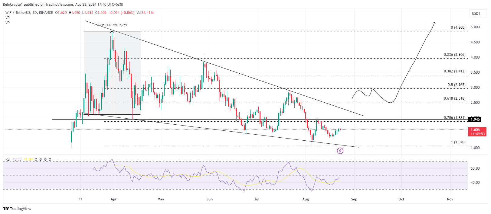 Sulla base del grafico giornaliero WIF/USDT, Dogwifhat (WIF) si è consolidato in un modello a cuneo discendente dalla fine di marzo. Questa formazione tecnica è considerata un modello di inversione rialzista. Si verifica quando il prezzo di un asset si comprime tra due linee di tendenza convergenti e inclinate verso il basso. La linea di tendenza superiore rappresenta una resistenza in calo, mentre la linea di tendenza inferiore mostra un supporto in calo.