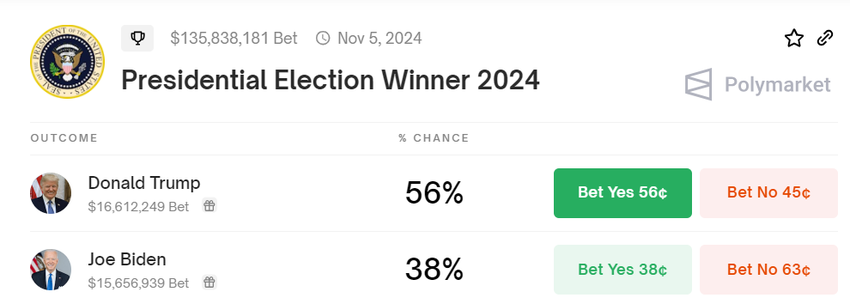 Nel frattempo, la posizione pro-crypto di Trump sembra migliorare le sue prospettive elettorali. Secondo Polymarket, una popolare piattaforma di previsione basata sulle criptovalute, Donald Trump ha il 56% di possibilità di vincere le elezioni, rispetto al 38% di Biden.