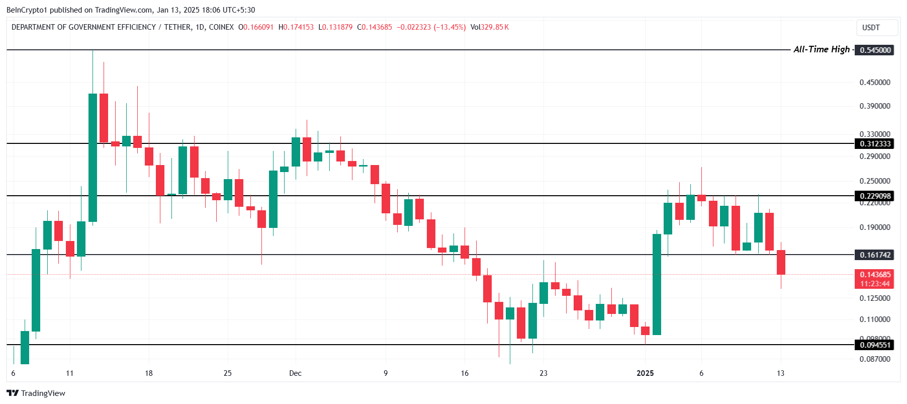 Tuttavia, se l’hype intorno a DOGE svanisce prima del previsto, la crypto potrebbe affrontare un calo. In tal caso, il memecoin potrebbe testare il supporto a 0.094 USD, cancellando i guadagni recenti e invalidando l’attuale outlook rialzista.
