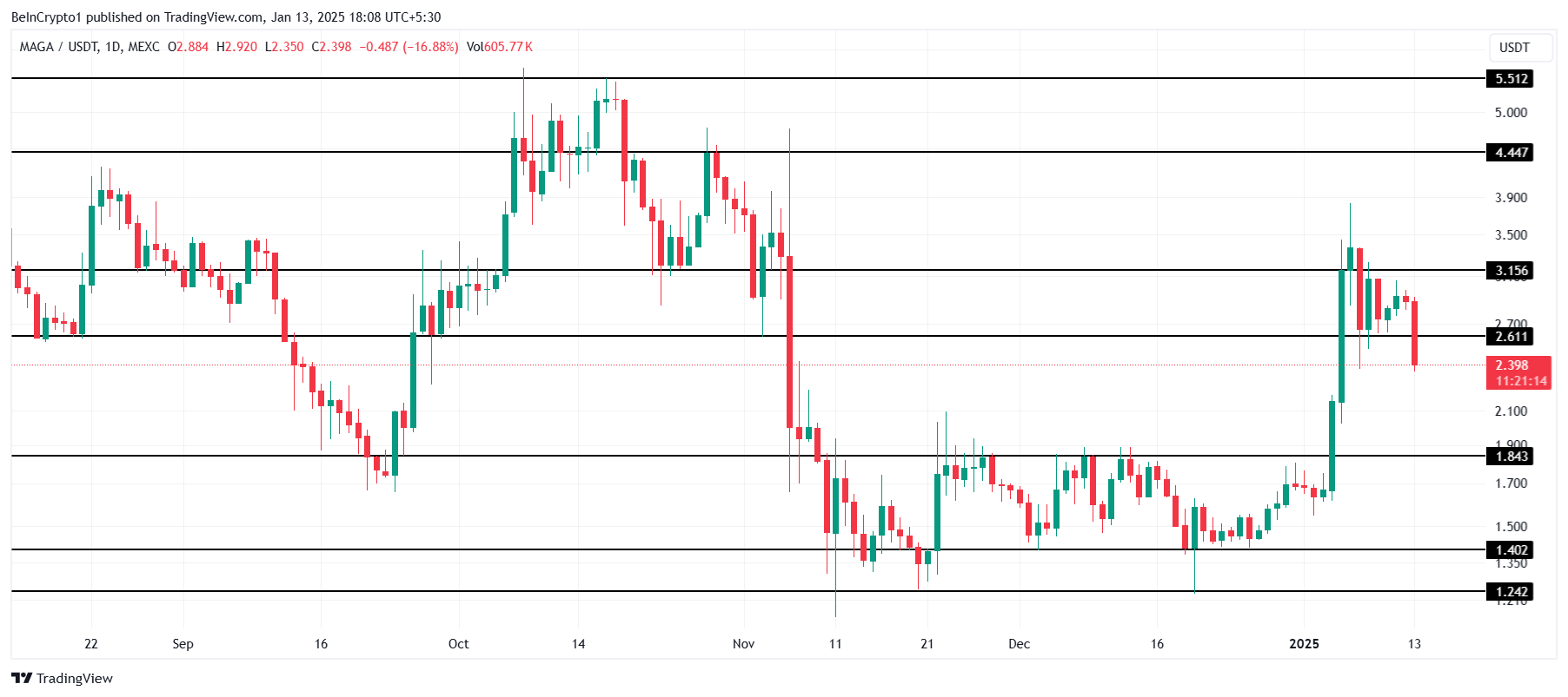 Tuttavia, se il sentimento rialzista non si materializza, TRUMP potrebbe affrontare ulteriori cali. È possibile una discesa a 1.84 USD mentre gli investitori cercano di incassare, specialmente con l’hype che ci si aspetta diminuisca dopo l’evento di inaugurazione.