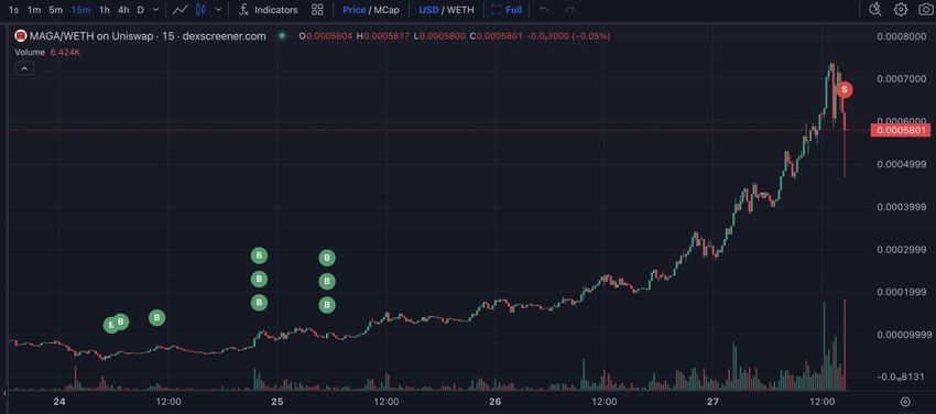 La piattaforma di tracciamento on-chain Lookonchain ha riferito che un trader di criptovalute ha guadagnato 2,7 milioni di dollari in soli tre giorni facendo trading di MAGA. Hanno ottenuto un ritorno sull’investimento (ROI) del 505%.