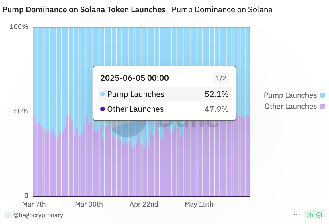 Pump.fun ha a lungo giocato un ruolo significativo nell’ecosistema di Solana, con oltre il 52% dei token lanciati su questa rete attraverso la loro piattaforma. Molti investitori hanno utilizzato SOL come proxy per beneficiare indirettamente delle entrate generate dalle commissioni di transazione di Pump.fun.