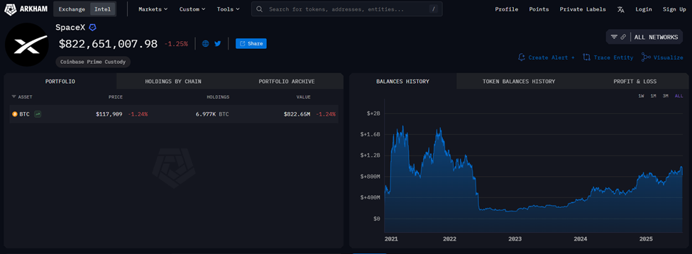 Secondo Arkham Intelligence, SpaceX detiene ancora 6.977 BTC, valutati approssimativamente $822,65 milioni.