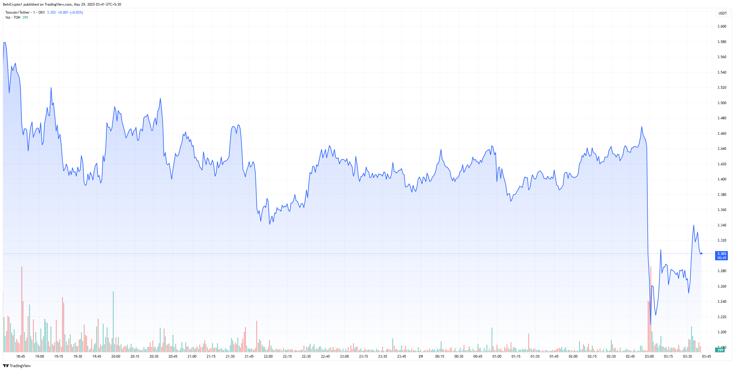 Il prezzo di TON ha rapidamente invertito la rotta. In 30 minuti, è sceso bruscamente da $3,45 a $3,27. Il grafico a 1 ora ora mostra un forte calo, anche se il token rimane in aumento dell’8% nella giornata.