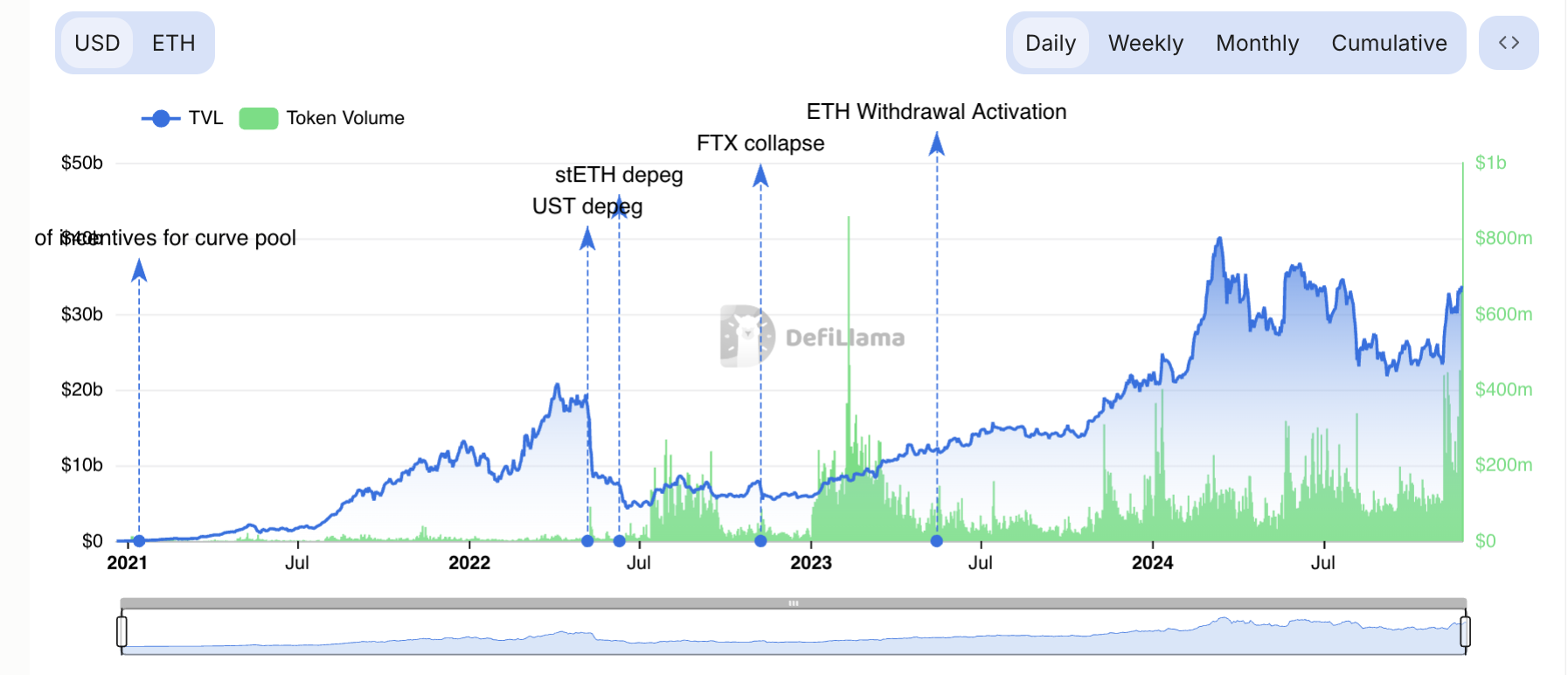 Oggi, il volume di scambi di LDO su exchange di criptovalute ha totalizzato 670 milioni USD. Secondo i dati di DefiLlama, questo rappresenta il suo massimo storico da quando il protocollo di staking ETH è stato lanciato.