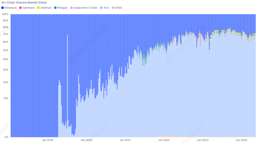 Esaminando la quota di mercato del volume della stablecoin si scopre che il volume delle transazioni di Ethereum supera di gran lunga il numero di transazioni, evidenziando il suo ruolo nel facilitare i trasferimenti di valore più elevato. Al contrario, catene come Polygon, Optimism e Avalanche hanno un numero maggiore di transazioni ma contribuiscono meno al volume complessivo, indicando il loro utilizzo per transazioni più piccole e più frequenti.