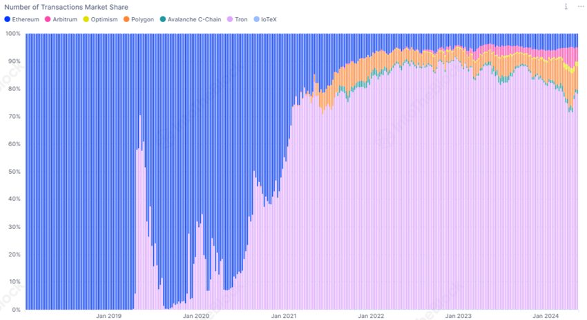 TRON è in testa per volume di transazioni con una quota dominante del 78%. Il grafico sottostante evidenzia la sua superiorità rispetto ad altre reti blockchain.