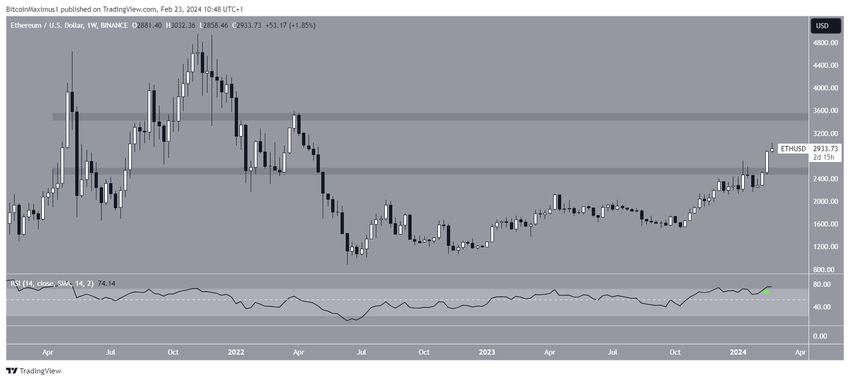 Il movimento al rialzo di Ethereum ha causato la prima chiusura settimanale al di sopra di un’area orizzontale a lungo termine, che ha agito a intermittenza come resistenza e supporto dall’aprile 2021. L’ETH ha raggiunto oggi un massimo di 3.032 dollari, il più alto dall’aprile 2022.