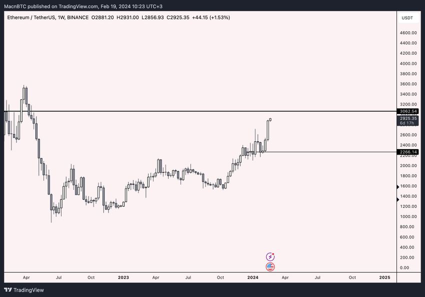 La scorsa settimana il prezzo di Ethereum (ETH) ha raggiunto la chiusura settimanale più alta dall’aprile 2022 e questa settimana ha superato i 3.000 dollari.
