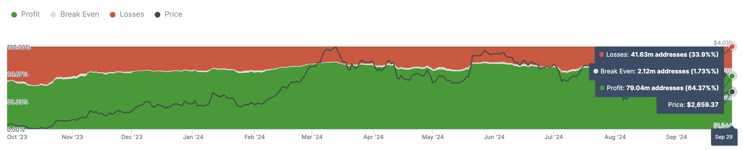 Inoltre, l’Historical In/Out of Money mostra che il rapporto dei detentori in profitto è salito dal 60% il 16 settembre al 64,37% oggi. L’HIOM, come è comunemente chiamato, mostra il livello di guadagni o perdite non realizzati nel mercato.