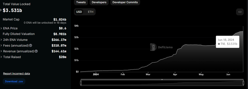 Nonostante le polemiche, Ethena ha recentemente raggiunto un traguardo notevole superando i 3,5 miliardi di dollari di valore totale bloccato (TVL). Al momento in cui scriviamo, il TVL di Ethena è di 3,53 miliardi di dollari, con un aumento del 47% circa negli ultimi 30 giorni.