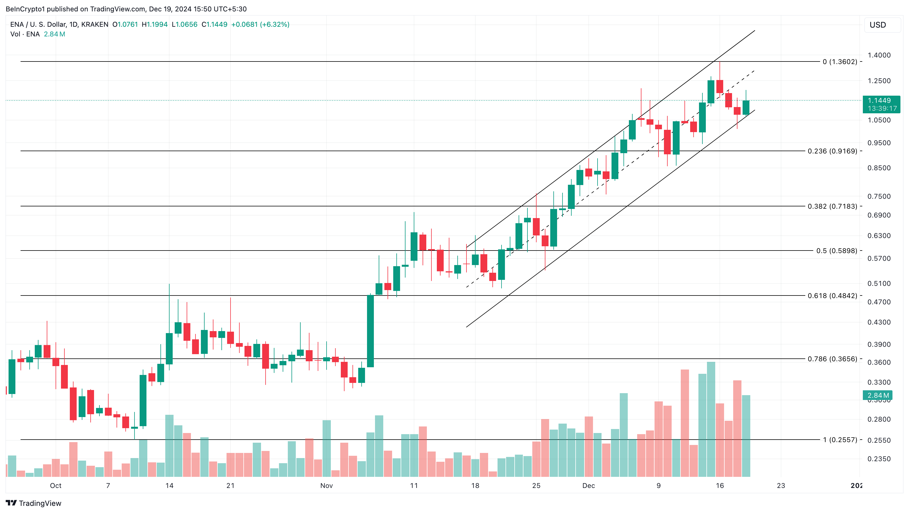 Il prezzo si muove tra queste due linee parallele, spesso indicando una tendenza rialzista con massimi e minimi crescenti. Se ENA non scende al di sotto della linea di supporto inferiore, allora il prezzo potrebbe salire oltre 1,36 USD.