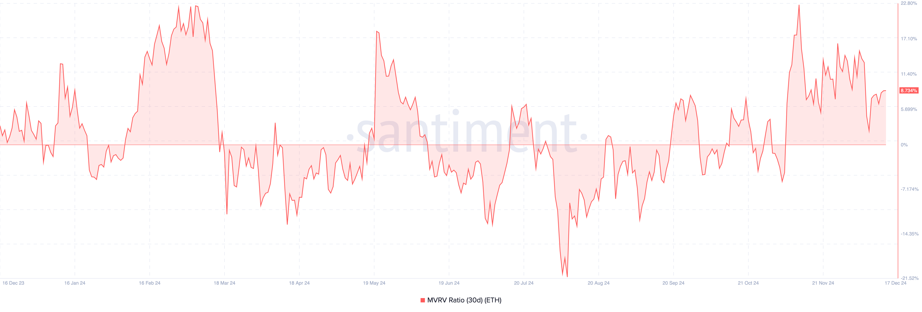 Tipicamente, più alto è il rapporto MVRV, più è probabile che i detentori vendano. Se è basso, aumenta le probabilità di HODLing. Secondo Santiment, il rapporto MVRV a 30 giorni di Ethereum è 8.73%, che è inferiore al 22.61% raggiunto a marzo.