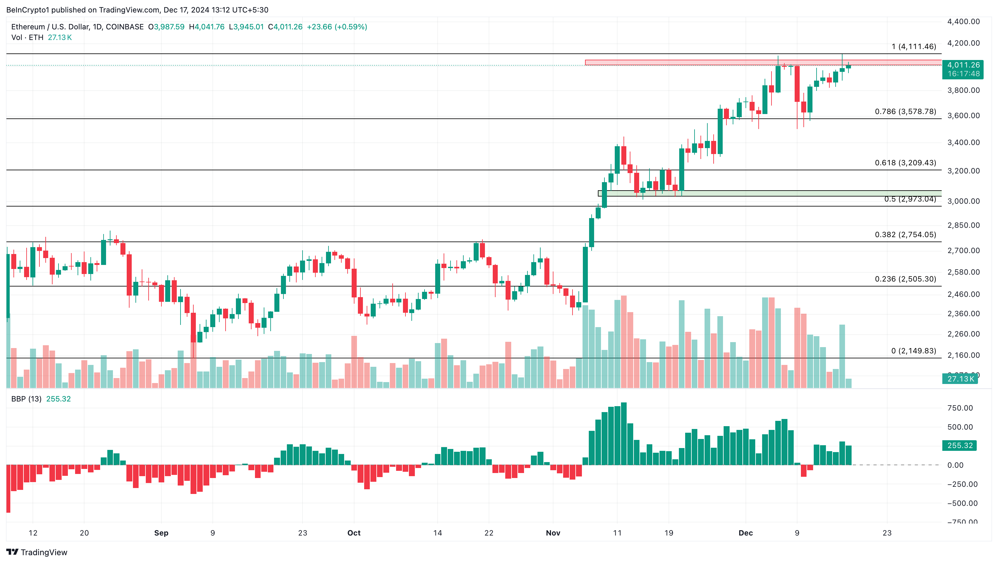 Il prezzo di Ethereum continua a mantenere un forte supporto intorno ai 3.075 USD sul grafico giornaliero, un livello che ha giocato un ruolo chiave nel guidare il recente rally. ETH ha anche superato la resistenza di 4.003 USD, indicando un continuo slancio rialzista.