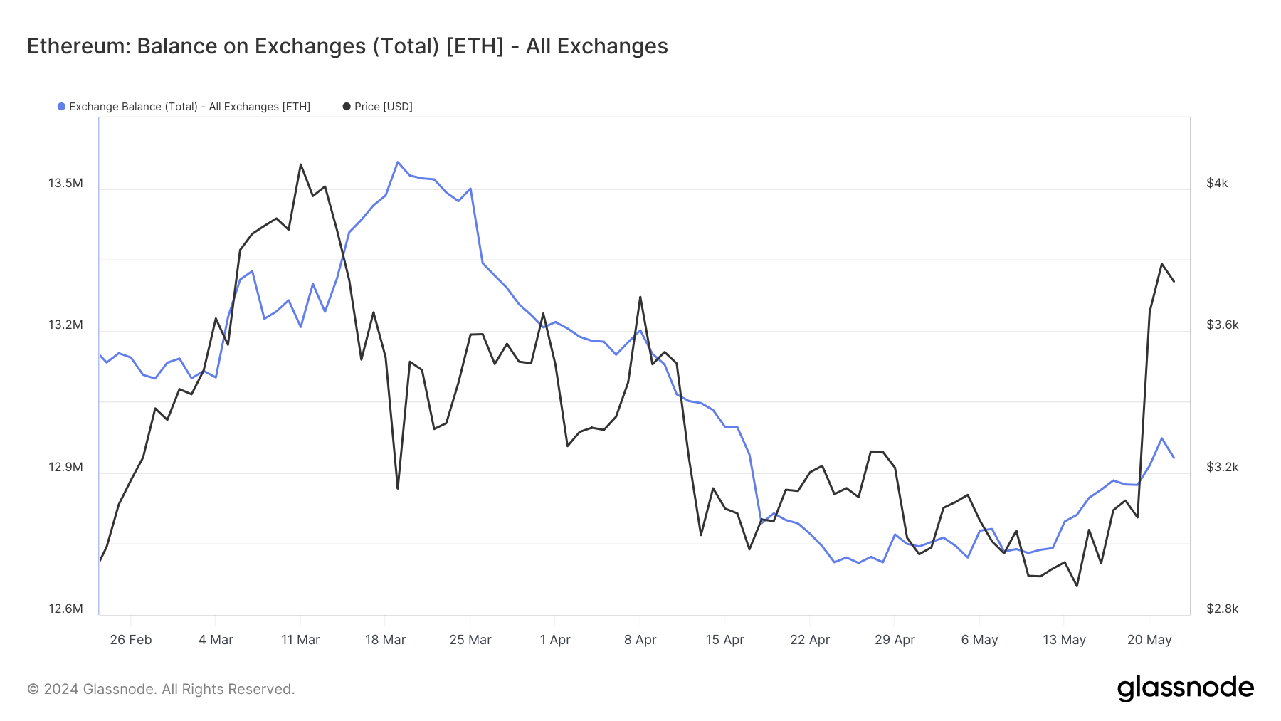 - Saldo sugli exchange: si riferisce all’importo totale di Ethereum detenuto nei portafogli degli exchange di criptovalute.