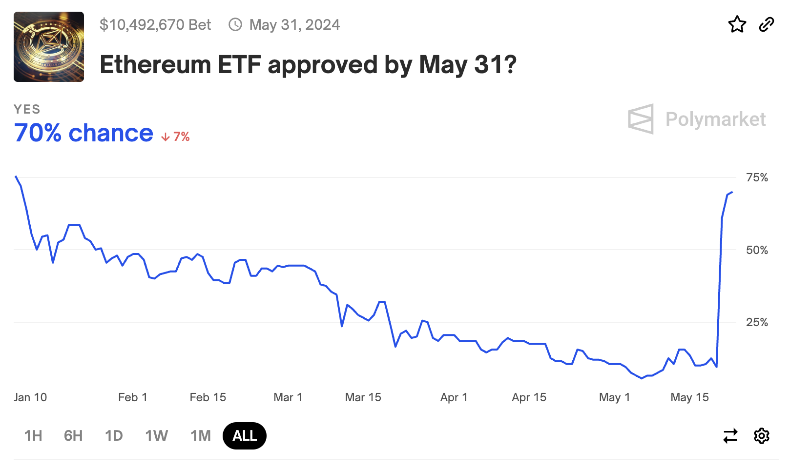 Allo stesso modo, Polymarket, una piattaforma decentralizzata di mercato pronostico che consente agli utenti di piazzare scommesse su eventi mondiali, mostra un aumento significativo delle quote di approvazione, che sono passate dal 10% al 70% nelle ultime 72 ore.